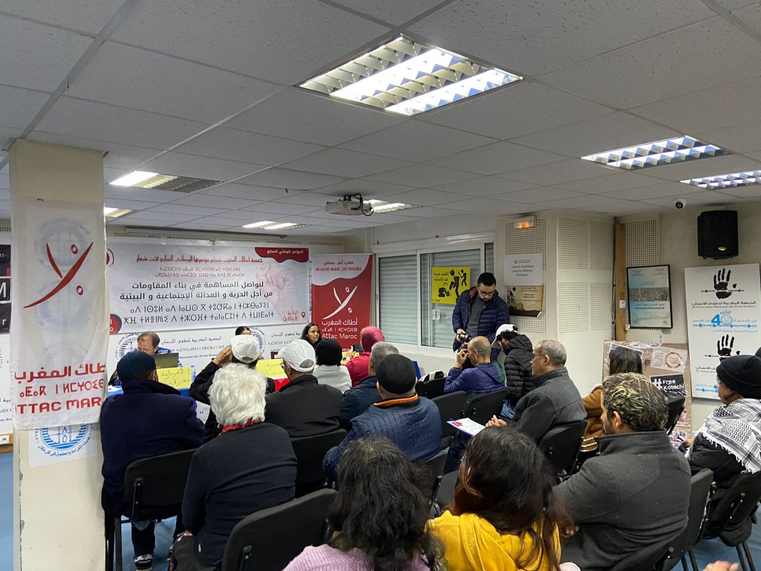 هذا المؤتمر الذي أقدمت ولاية الرباط على منع استعمال قاعة علال الفاسي العمومية لاحتضان جلسته الافتتاحية، ما يؤكد، مرة أخرى، إمعان السلطات في مواصلة مسلسل التضييق الممارس على جمعية أطاك منذ حوالي عشرين سنة من وجودها. وهو منع، لا يوازيه سوى إصرار أطاك على فرض تنظيم مؤتمرها في ظروف عادية، إذ جرى احتضان الجلسة الافتتاحية بمقر الجمعية المغربية لحقوق الانسان مساء يوم الجمعة 16 دجنبر بالرباط، التي حضرها عدد من ممثلي/ات منظمات النضال بالمغرب ومنابر صحفية، لتتواصل أشغال المؤتمر يومي السبت والأحد 17 و18 دجنبر بالمقر المركزي للجامعة الوطنية للتعليم-التوجه الديمقراطي بالرباط.
