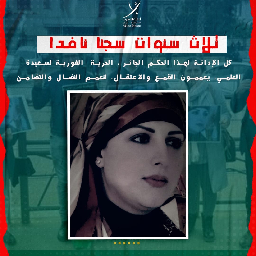 نطقت عدالة الاستبداد يوم 21 شتنبر 2022 بمحكمة الاستئناف بالدار البيضاء بحكمها الجائر والقاضي بثلاث سنوات سجنا نافدة في حق المناضلة والمدونة سعيدة العلمي. ُسجنت سعيدة لأنها عارضت بشجاعة سياسات اقتصادية واجتماعية ظالمة، وعبرت بقلمها الجريء عن موقفها الرافض لتحكم آليات الاستبداد والفساد في حياة الشعب المغربي. ودعت سعيدة من خلال منشوراتها على مواقع التواصل الاجتماعي إلى النضال لفك أسْر المعتقلين ظلما وتحقيق حياة تسودها الحرية والعدالة و الديمقراطية والكرامة. ُعرفت سعيدة بدفاعها الشرش عن حريات التعبير، وجسدت تضامنها من خلال حضورها الميداني رفقة أسر معتقلي الرأي في جلسات المحاكمات غير العادلة التي كانت تجري أطوارها في مدينة الدار البيضاء.