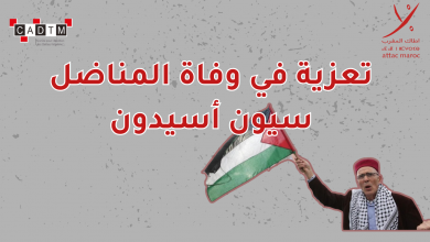 بقلوب مكلومة تلقت المجموعة المحلية لجمعية أطاك المغرب النبأ الفاجعة في فقدان أحد أهم مناضليها ومؤسسي فرعها إثر حادثة سير مفجعة ويتعلق الأمر بالرفيق الغالي خالد بشرى الذي ودعناه جميعا إلى مرقده الأخير عصر يوم الخميس 13 نوفمبر 2014 ..وبهذه المناسبة الأليمة تتقدم المجموعة لأسرة الفقيد الراحل الصغيرة والكبيرة وكذا لرفاقه ومعارفه بأحر التعازي متمنية لهم الصبر والسلوان في هذا المصاب الجلل…جرحنا في فقدان الغالي غائر ..