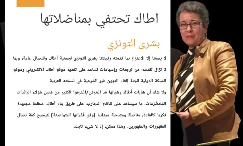 بعد هذه الشهادة الحية، لا يسعنا إلا الاعتزاز بما قدمته رفيقتنا بشرى التونزي لجمعية أطاك وللنضال عامة، وبما لا تزال تقدمه؛ من ترجمات وإسهامات تساعد على تغذية موقع أطاك الالكتروني وموقع الشبكة الدولية للجنة إلغاء الديون غير الشرعية في نسخته العربية، والاعتزاز كذلك بما قدمته/تقدمه كل من لوسيل دوما وسعاد كنون وزينة أبيهي كرائدات وواضعات اللبنات الأولى لأطاك. لا شك أن شابات أطاك وشبانها قد اغْترفن/اغْترفوا الكثير من مَعين هؤلاء الرائدات المُخَضْرَمات، ما سيساعد على تلاقح التجارب، كُهولا وشبابا، على طريق بناء أطاك، منظمة مجتهدة فكريا كالعادة، مناضلة ومتدخلة ميدانيا [وفق قُدُراتها المتواضعة] لترجيح كفة نضال المقهورات والمقهورين، وهذا ممكن، إذ لا شيء ثابت. فلندع جانبا ما يشكله الواقع الحالي من احباطات، ولننظر إلى المستقبل بعين متفائلة، مسلحين بصلابة الإرادة.