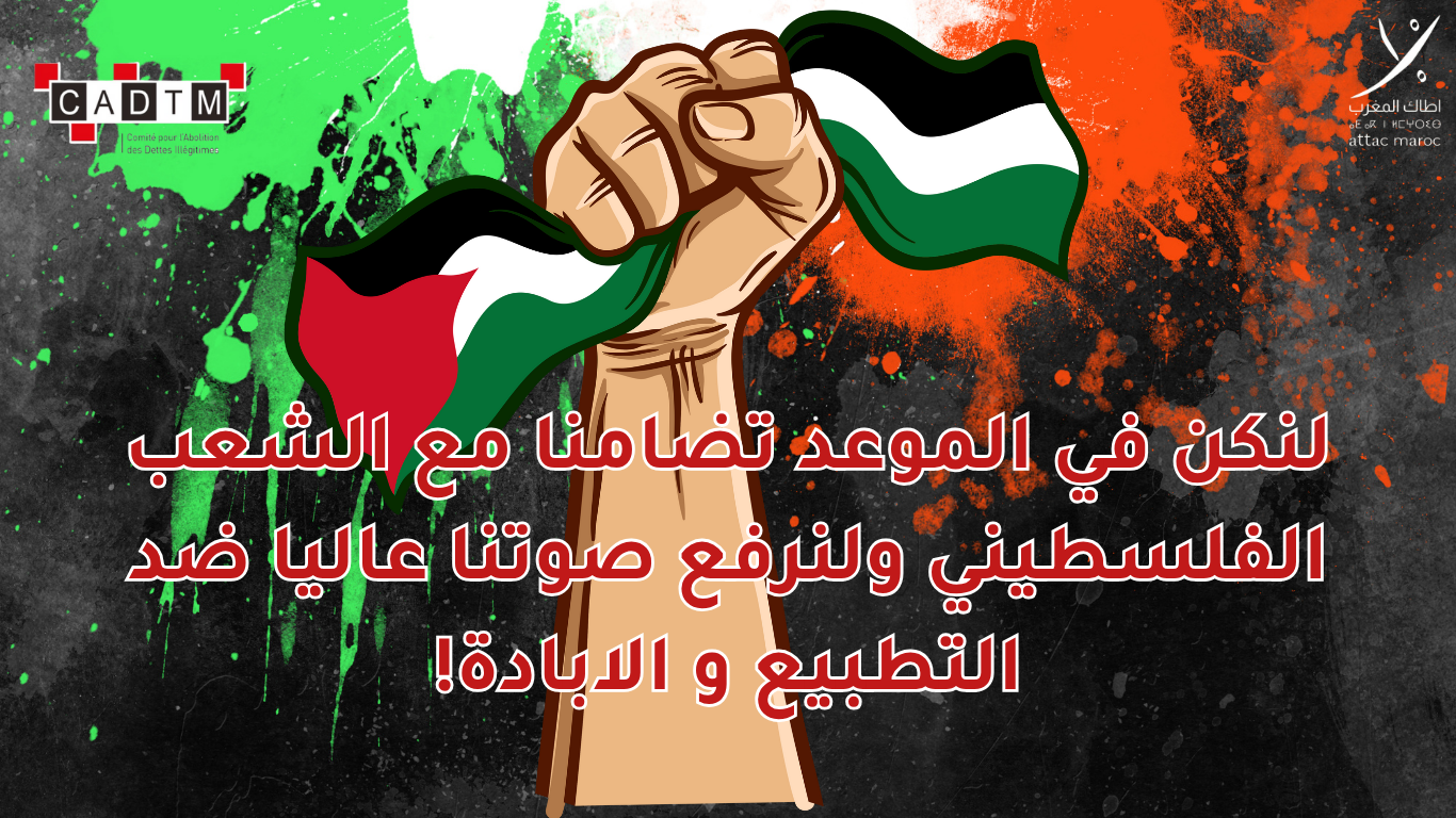 تدعو جمعية أطاك المغرب كل منخرطيها ومنخرطاتها وكافة المتعاطفين معها وعموم الشعب المغربي للمشاركة في هذه المسيرة الشعبية التي ستنطلق من أمام عمارة السعادة بالرباط ابتداء من الساعة العاشرة صباحا للوقوف الى جانب الشعب الفلسطيني وللاحتجاج على مواصلة الابادة الصهيونية وللتنديد بالتطبيع وما ينتج عنه من تعاون اقتصادي وعسكري ، حيث تسمح الدولة للصهاينة بالاستثمار داخل البلد وتقيم معهم تعاونا عسكريا وتفتح لهم موانئ المغرب، خصوصا مينائي طنجة و الدار البيضاء، لمرور السفن المحملة بالقطع العسكرية.
