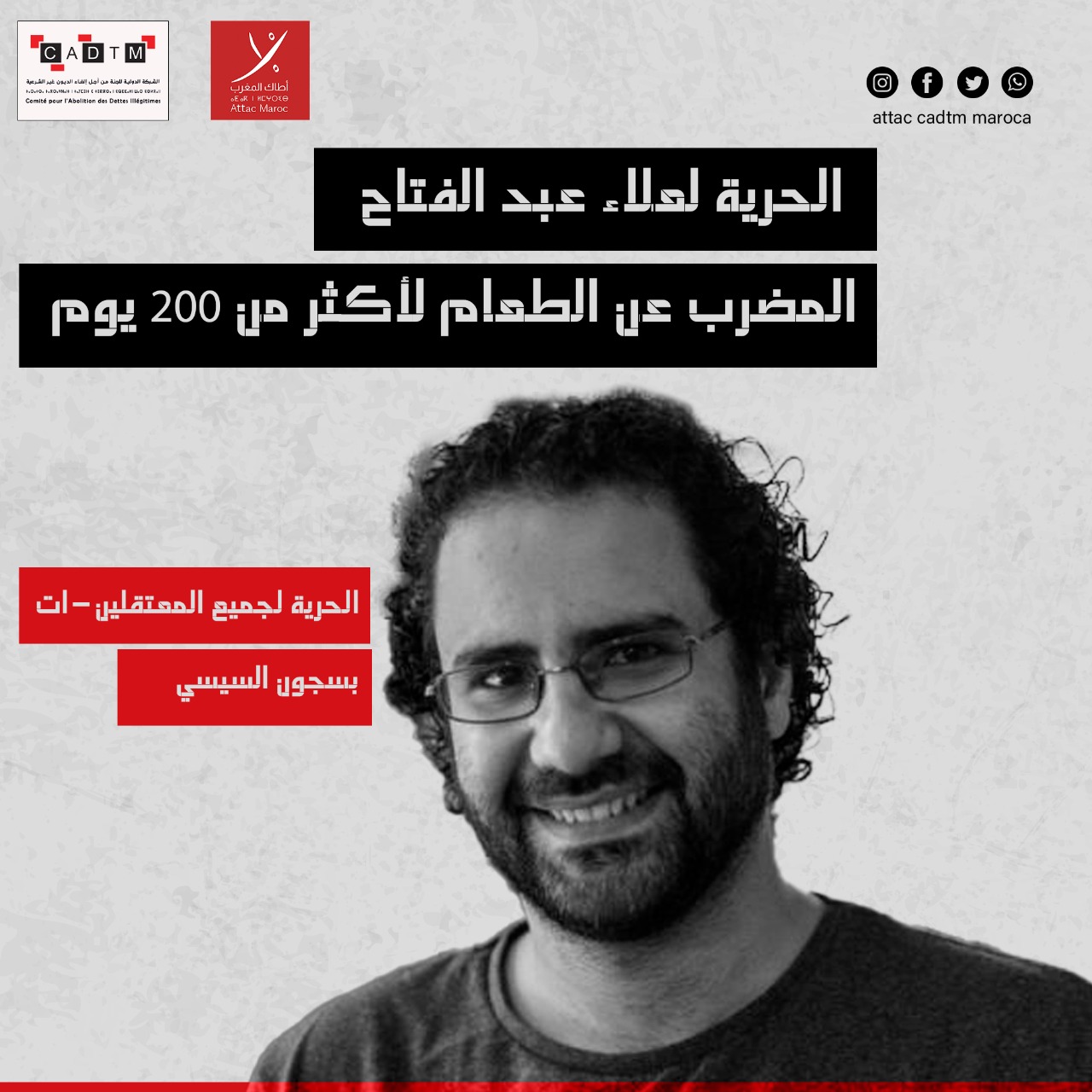 علاء عبد الفتّاح احد الشباب المصريين المدافعين عن حرية التعبير، كسب شعبيته من خلال تغريداته وتعليقاته النقدية بوجه ممارسة نظام السلطة القمعية عبر وسائل التواصل الاجتماعي… تعرض على إثره اللاعتقال والسجن في عهد مبارك لمشاركته في احتجاج وحُوكم لشهرين في العام 2011، كما اُعتقل وأُحتجز أيضا في العام 2013 لمدة 115 يوما دون محاكمة قبل أن يَصدر في حقه أخيرا حكماً بقرابة ستة سنوات سجناً، تلتها فترة مراقبة إضافية لخمس سنوات أخرى كانت على شكل قضاء كل ليلة في قسم البوليس. بعد انصرام أشهر من المراقبة، مورس الاعتقال في حقه بتهم “نشر أخبار كاذبة والانتماء لمنظمة إرهابية”، ليظل حبيس السجن (أضرب عن الطعام خلال شهر أبريل من العام 2020) حتى صدور الحكم في حقه في العام 2021 مجددا بقضاء خمس سنوات أخرى في السجن. ومنذ أبريل من 2022 يُضرب علاء عبد الفتاح عن الطعام احتجاجا على حرمانه من كل حقوقه بالسجن. وكان أن قام بالإعلان عن تصعيد خطوته هاته بالتوقف عن شرب الماء منذ 6 نونبر من العام 2022 بالتزامن مع انعقاد قمة المناخcop 27 بمصر.