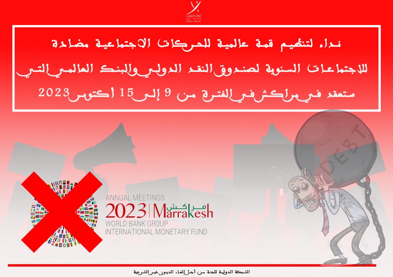 نداء لتنظيم قمة عالمية للحركات الاجتماعية مضادة للاجتماعات السنوية لصندوق النقد الدولي والبنك العالمي التي ستعقد في مراكش في الفترة من 9 إلى 15 أكتوبر 2023