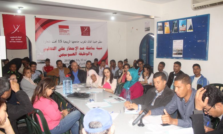 عقدت جمعية أطاك المغرب جامعتها الربيعية في دورتها الخامسة عشر يومي 13 و14 ابريل 2019 بمقر الحزب الاشتراكي الموحد بمراكش تحت شعار: ” شبيبة مناضلة ضد الاجهاز على التعليم والوظيفة العموميتين” بحضور مناضلات ومناضلين من مجموعات أطاك المحلية ومن فئات تعليمية تناضل بالميدان كالتنسيقية الوطنية للأساتذة الذين فرض عليهم التعاقد، والتنسيقية الوطنية لموظفي وزارة التربية الوطنية حاملي الشواهد، وتنسيقية الزنزانة 9، ونقابيين بالتعليم، وكذا طلبة الطب وممثلين عن الممرضين، وتلاميذ وطلبة ونشطاء آخرون. وقد كانت هذه الجامعة فرصة لتعميق النقاش حول الهجوم النيوليبرالي الذي تشنه الدولة بتوجيهات من المؤسسات المالية الدولية، وتلاقح التجارب وتبادلها، وتقديم مقترحات لتقويتها وتوحيدها.