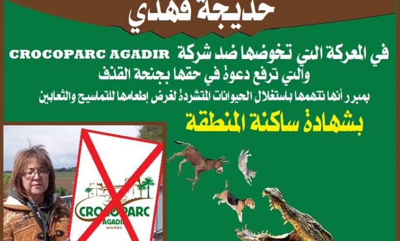 تابعت مجموعة إنزكان لأطاك المغرب باستغراب قيام شركة كروكوبارك لتربية التماسيح في الأسر بنواحي الدراركة بأكادير برفع دعوى قضائية ضد المناضلة خديجة فهدي تتهمها بكتابة مقال في الفايسبوك يطرح وجهة نظرها في النظام الغذائي المتبع لتغذية مئات التساميح لتسريع نموها، حيث يعتقد أن الشركة قد تلجأ إلى إطعام هذه التماسيح بالقطط و الكلاب الضالة.