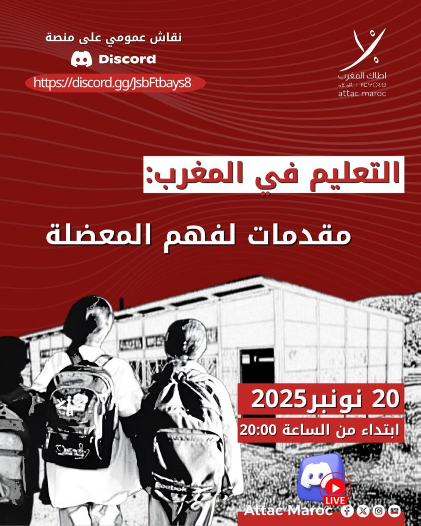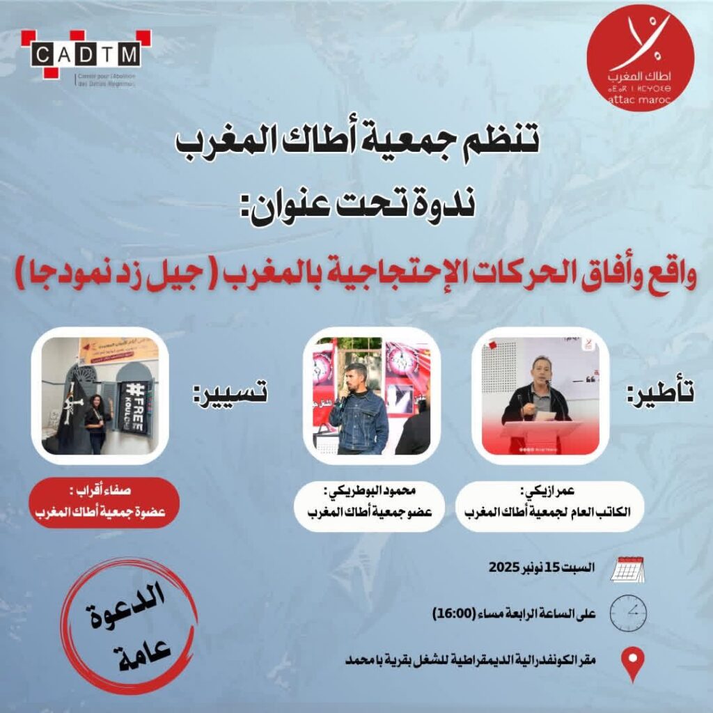 تنظم جمعيه اطاك المغرب ندوه تحت عنوان ”واقع وافاق الحركات الاحتجاجيه بالمغرب جيل زد نموذجا”