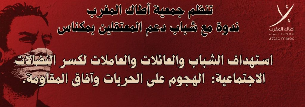 تنظم جمعية أطاك المغرب ندوة عمومية تحت شعار: “الهجوم على الحريات وآفاق المقاومة: استهداف الشباب والعائلات والعاملات لكسر النضالات الاجتماعية”، وذلك يوم الأحد 14 دجنبر 2025، بمقر الحزب الاشتراكي الموحد بمدينة مكناس. نريد من خلال هذه الندوة أن نفتح نقاشا جماعيا لاستشراف آفاق توحيد النضالات بين هذه الجبهات أساسا على مستوى مكناس، وتعزيز آليات التضامن.
